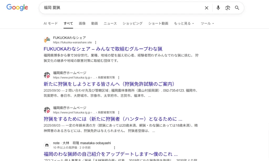 いっちょ狩猟(しゅりょ)ってみますか、と思ったはいいものの、わな仕掛けるってなに?どこに仕掛けていいの?わなって買うの?などなど何もわからない状態だったので、とりあえず「福岡 罠猟」で検索してみたのがFUKUOKAわなシェアとの出会いのきっかけでした。