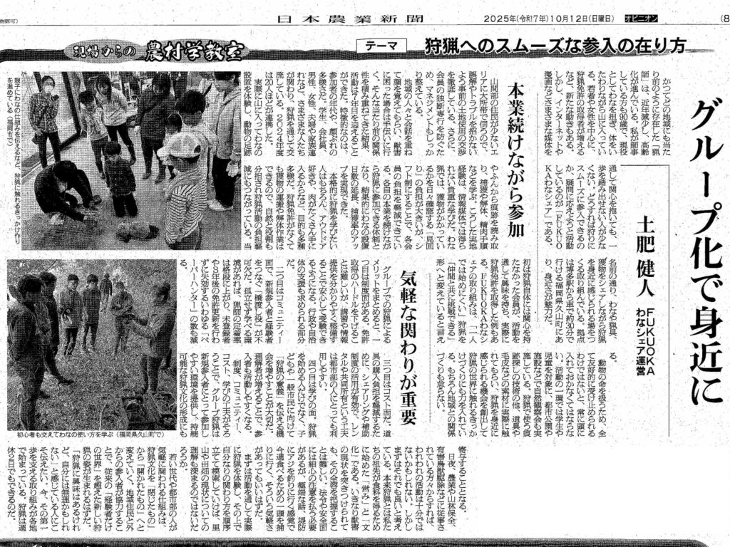 狩猟へのスムーズな参入の在り方について、FUKUOKAわなシェアの活動を例に綴らせていただきました。