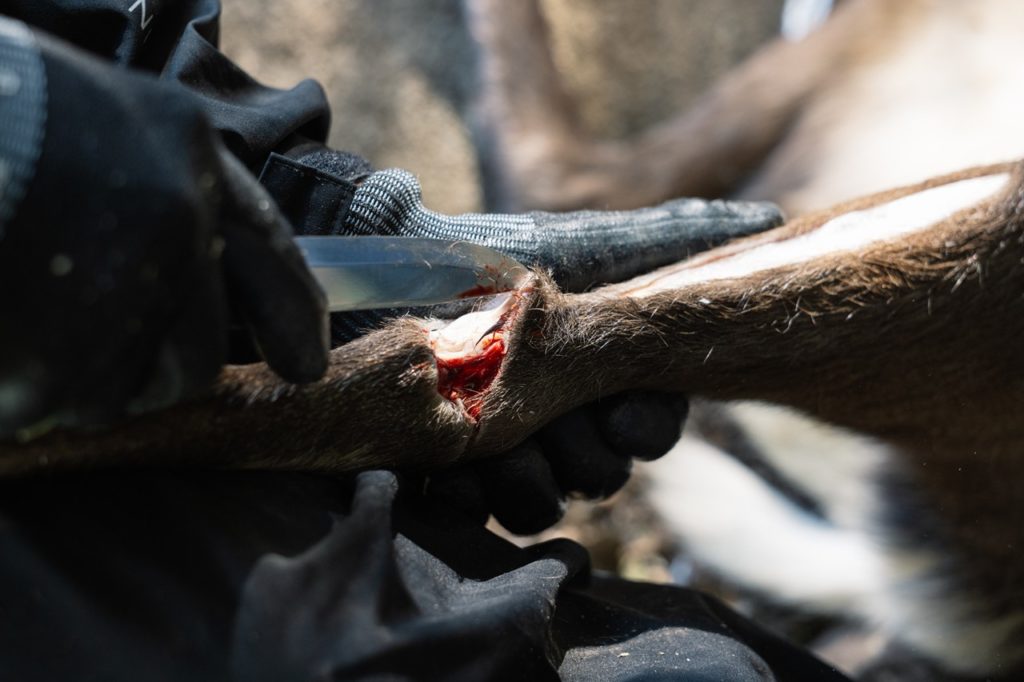 保護者と共に鹿(写真は前脚)の精肉を行う